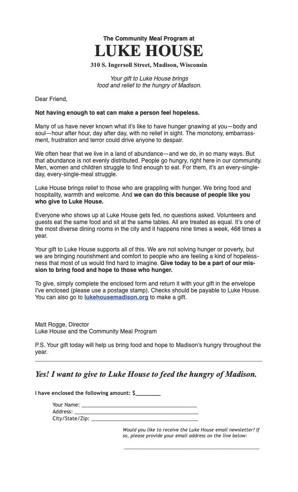 The precisely written letter can be the foundation for an entire operation. This one-color, unadorned letter and two other letters like it—each sent as a single annual mailing to a list of around 500—entirely funded the operations of a 40-year-old meal program that feeds thousands of homeless and hungry people nine times a week, 52 weeks of the year.