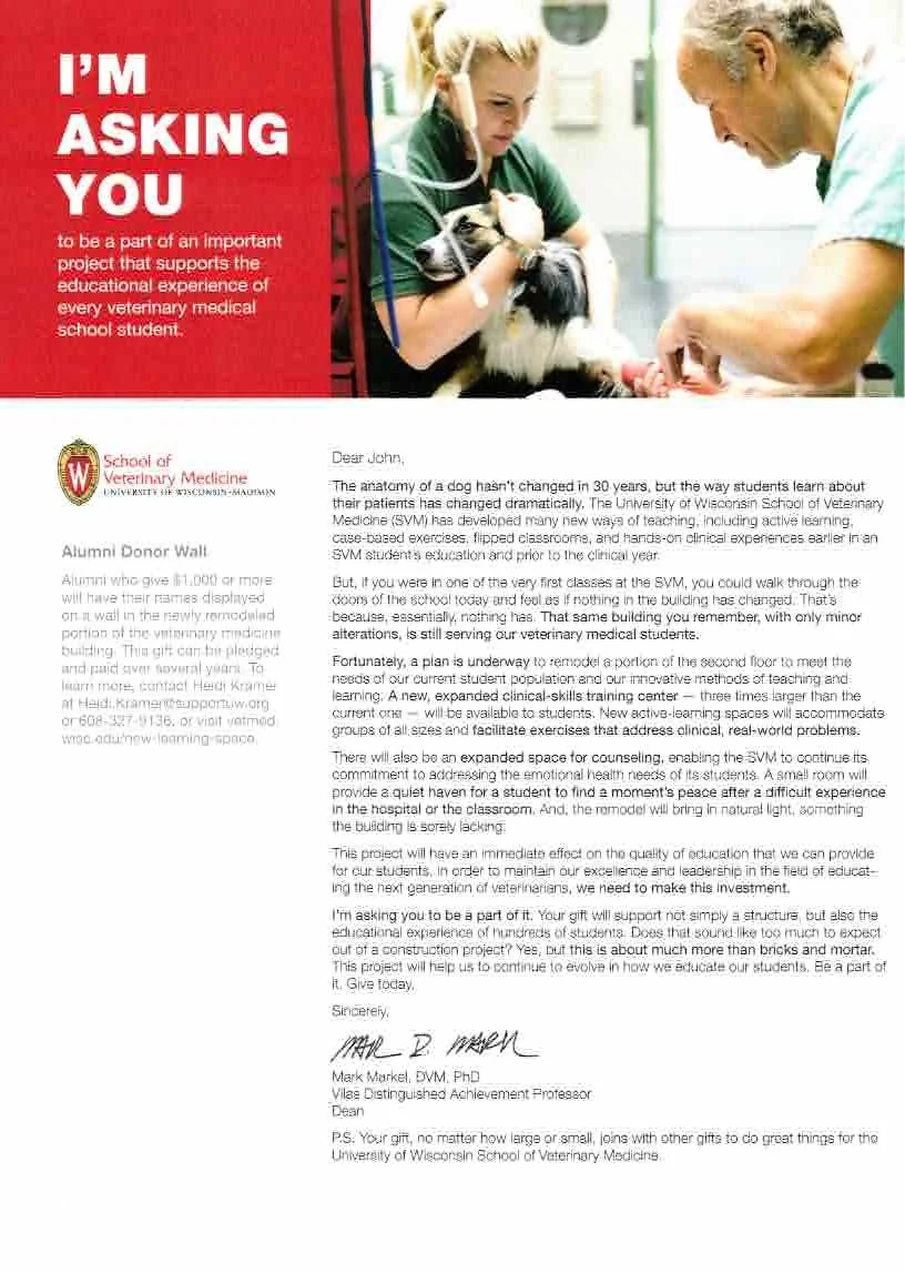 This is a letter sent to the owners of animal patients. The audience is well acquainted with the veterinary hospital but might not understand its connection to the vet school. Copy and image convey the underlying focus: the love we have for our pets.