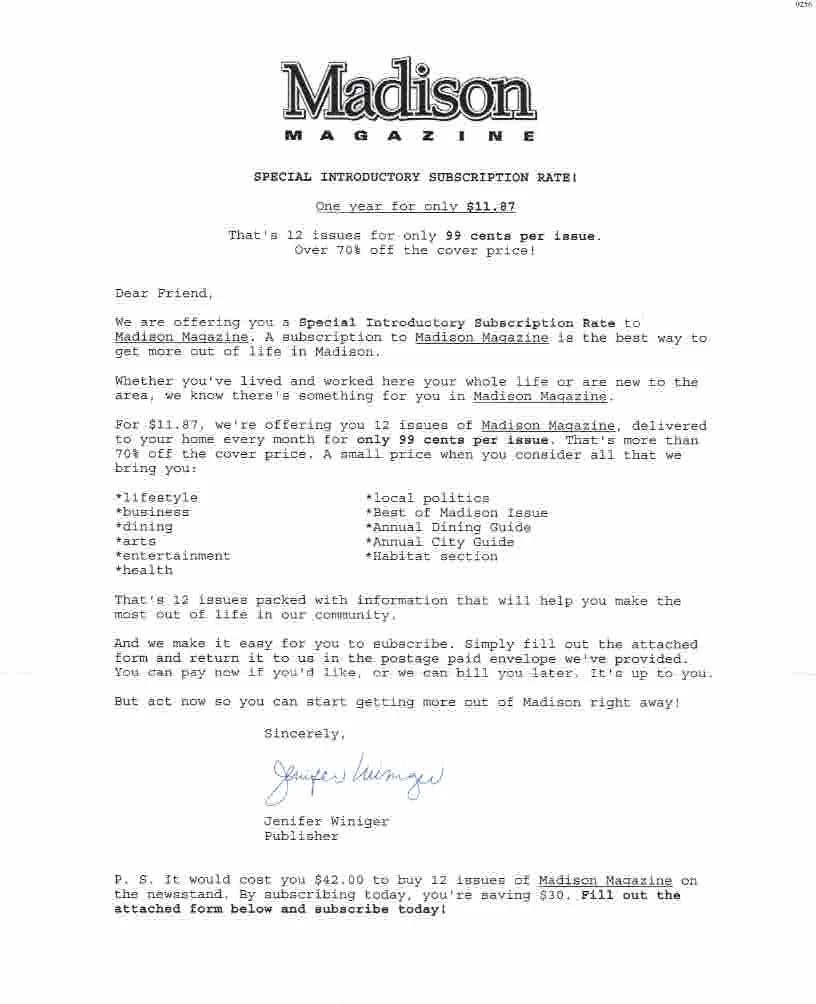 Great direct response marketing works. Tested, tested and tested again, this bare-bones letter transformed the circulation of this local magazine and breathed new life into the enterprise.