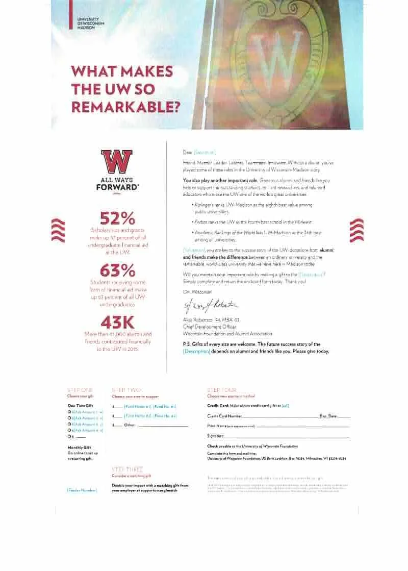 A letter appealing to a broad audience of alumni and supporters. Written to be customized with different gift amounts and scholarship funds. A just-the-facts solicitation that served as a workhorse for the annual campaign.